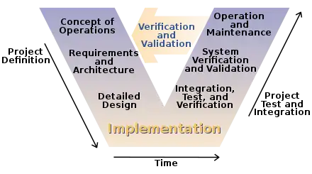 In software development, the V-model[2] represents a development process that may be considered an extension of the waterfall model, and is an example of the more general V-model. Instead of moving down in a linear way, the process steps are bent upwards after the coding phase, to form the typical V shape. The V-Model demonstrates the relationships between each phase of the development life cycle and its associated phase of testing. The horizontal and vertical axes represent time or project completeness (left-to-right) and level of abstraction (coarsest-grain abstraction uppermost), respectively.