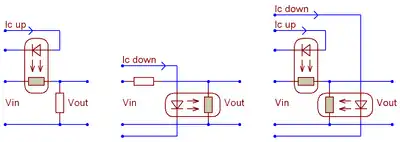In the simplest output-limiting circuits, the RO is placed in the top (series connection) or lower (shunt) arm of the voltage divider.[70] The series connection provides a greater controlling range (−80 dB) at DC and low frequencies. The operation is complicated by the nonlinearity of the resistance vs. the controlling current. The narrowing of the dynamic range due to the parasitic capacitance is significant at frequencies as low as hundreds of Hz. The reaction is significantly faster to the increase than decrease in the controlling current.[71]