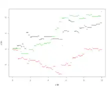 Three sample paths of variance gamma processes (in resp. red, green, black)