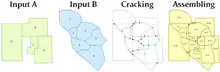 - Assembling part A: Find each minimal closed ring of lines, and use it to create a polygon. Each of these will be a least common geographic unit (LCGU), with at most one "parent" polygon from each of the two inputs.