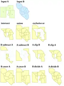The goal of all overlay operations is to take in vector layers, and create a layer that integrates both the geometry and the attributes of the inputs.[10] Usually, both inputs are polygon layers, but lines and points are allowed in many operations, with simpler processing.