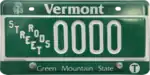 Motorcycle | Debossed white serial on green plate with border line; "VERMONT" at top left and "MOTORCYCLE" at bottom; debossed box for revalidation sticker at top right | AB123 | AA100 to RE753 (as of June 4, 2022) | |
