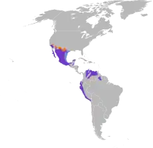 Their range includes almost all of Mexico, extending north into the southwestern United States, and south to scattered portions of Central America, and parts of northwestern and central South America. It has ranged as far north as Canada.[20] North American populations are generally resident, migrating only at the edge of the range. South American populations, especially those further south, may make long migrations to the northernmost parts of the Brazilian Amazon. This reflects a tendency to overwinter in areas where the temperature does not go below −1 °C (30 °F). Migrations may extend up to 4,000 km (2,500 mi). North American populations generally migrate by late August and return between February and April.[2] Their ability to migrate likely aided their wide colonization of the Americas.[8]