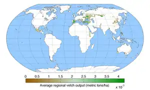 In 2017, global production of vetches was 920,537 tonnes.[8] That year, 560,077 acreas were devoted to the cultivation of vetches in the world. Over 54% of that output came from Europe alone. Africa (17.8% of world total), Asia (15.6% of world total), Americas (10.6% of world total) and Oceania (1.8% of world total).[14]