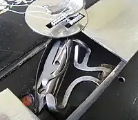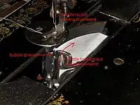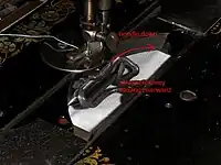 The following photo gallery shows the vibrating shuttle cycling through a single stitch. In the pictures, the silver sliding covers have been opened to show the operation of the shuttle; normally they would be closed to prevent interference between the workpiece and the shuttle.