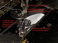 Shuttle is forward and beginning to move rearward. Needle is up and beginning to move downward. |
