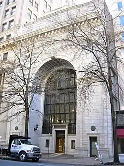 Virginia Mutual Building, also known as the Virginia Trust Company Building, is a historic bank building located in Richmond, Virginia. It was designed by architect Alfred Bossom and built in 1920–1921. It is a six level, Classical Revival style building constructed of white granite with terra cotta ornament. The front facade is in the form of a Roman triumphal arch, reminiscent of the Arch of Titus, with an overall height of 91 feet.[3] The building is occupied by the Tredegar Trust Company.