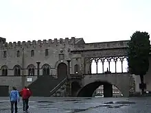 The palace at Viterbo had been the residence of the Bishop of Viterbo until the 1250s.[5] Alexander IV (1254–1261) enlarged the palace for use as a papal residence.[5] A large three-storied addition was completed in 1266, during the reign of Clement IV (1264–1268).[5] The palace was redecorated in the 1290s, and some of the new additions bear the Caetani coat-of-arms of Pope Boniface VIII (1294–1303).[5] According to Prof. Radke, although Boniface VIII never even visited Viterbo during his papacy, "the papal arms indicate that the structure had not completely lost its papal associations."[5]