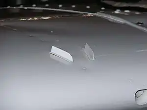 A vortex generator (VG) is an aerodynamic device, consisting of a small vane usually attached to a lifting surface (or airfoil, such as an aircraft wing)[1] or a rotor blade of a wind turbine.[2] VGs may also be attached to some part of an aerodynamic vehicle such as an aircraft fuselage or a car. When the airfoil or the body is in motion relative to the air, the VG creates a vortex,[1][3] which, by removing some part of the slow-moving boundary layer in contact with the airfoil surface, delays local flow separation and aerodynamic stalling, thereby improving the effectiveness of wings and control surfaces, such as flaps, elevators, ailerons, and rudders.[3]