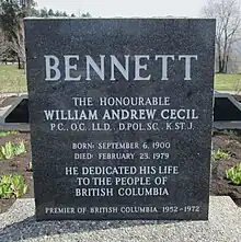 - 1 2 "W.A.C. Bennett, former B.C. premier". CBC. Retrieved 25 March 2023.