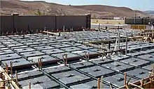The Wafflemat foundation system, also called a waffle slab foundation, is an above-ground mat foundation used to provide load-bearing capacity on expansive, rocky, compressible, or hydro collapsible soils. The slab is created by placing a series of plastic forms ("Waffleboxes") that are either 8.5 or 12 inches (220 or 300 mm) in height, and 19 by 19 inches (480 mm × 480 mm) in plan, directly on grade to create a waffle-like grid of ribs, and then monolithically pour a post-tensioned reinforced concrete slab over the Waffleboxes. The completed slab then sits on the ground as a 'raft', with the void areas underneath the slab allowing for soil movement.[1]