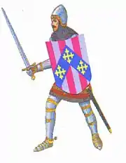 Walter Talbot, later surnamed Carpenter, inherited by Royal license and the required surname change, an Arms from his first wife, the widow Lady Carpenter. These arms appear to be of French or Norman heritage, "Paly of six, argent and gules, on a chevron azure, 3 cross crosslets or." Crest, on a wreath a globe in a frame all or. Supporters, two horses, party-perfess, embattled argent and gules. Motto: "Per Acuta Belli" (Through the Asperities of War). These arms descend from John Carpenter, the younger (c. 1372 – 1442) who was the noted Town Clerk of London during the reigns of King Henry V & King Henry VI.[6]