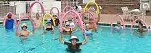 A water aerobics class incorporating flotation devices.