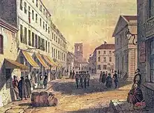 The Spanish water infrastructure continued to be used by the British well after the capture of Gibraltar in 1704. As late as 1863, there was not a single water pipe in the town apart from the Spanish aqueduct.[12] The main source of drinking water, other than the aqueduct, was rainwater that had been collected during the winter. The British military relied on large cisterns mounted on the roofs of buildings to gather rainwater, while ordinary Gibraltarians used barrels and large earthenware pots called tinajas. At the time, most Gibraltarians lived in two- or three-storey buildings with an interior courtyard, called patios, which were occupied by two or three families. They were generally owned either by absentee landlords or the British government, neither of which had much interest in building private cisterns. The courtyards of the patios were thus crowded with barrels and tinajas which supplied the occupants' water during the summer drought. If they ran out, the only other source of water was from pedlars who brought barrels of water in from Spain, charging high prices for the privilege. This encouraged many people to recycle their water as much as possible, reusing the same water for different purposes.[13]