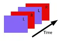 • Time-based multiplexing. Methods such as frame sequential combine two separate video signals into one signal by alternating the left and right images in successive frames.