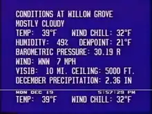 | Current ConditionsWS | This product outlines current weather observations for the local area. The primary product details observation data for a specific location – consisting of sky condition; actual and apparent temperature (including heat index values during the spring and summer, wind chill mainly during the winter when applicable); wind speed/direction/gusts; dew point; barometric pressure; and humidity (cloud ceiling data was generated by STAR models from WeatherStar XL and earlier). Two additional observation products were used prior to April 2013: one that provided sky condition, temperature and wind data for six to eight cities within a 100-mile (160 km) radius (the number of cities varied depending on the STAR system and the number of available reporting stations) and regional sky condition and temperature data within a 250-mile (400 km) radius of the local area (the latter product was discontinued on the WeatherStar XL in July 2002).