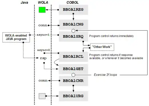 As the picture illustrates, the asynchronous mode allows the non-Java program to get control and do other processing. That implies checking for a response at some future point. BBOA1RCL is used for that purpose. In this example BBOA1RCL is issued synchronously (parameter async=0). If a response is available BBOA1RCL will provide the length and program control returns to the program. If no response is available BBOA1RCL holds program control until one is available. BBOA1RCL with async=1 will return x'FFFFFFFF' if no response is available; program control is returned immediately.