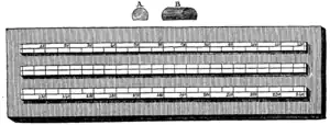 To facilitate the temperature calculation, Wedgwood built a device which would directly read the temperature. Two metal bars with scales on them were fixed one above another on a metal plate and inclined at a small angle. The spacing between the bars was 0.5 inches at one end and 0.3 inches at the lower end. The scale was divided into 240 equidistant parts. The unheated piece of clay would fit the 0.5-inch gap giving the zero temperature reading. After annealing, the clay cylinder would shrink and fit somewhere in between the left and right ends of the bars, and the temperature could be read from the scales on the bars.[4][5]