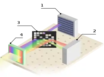 Weighing matrices appear in the engineering of spectrometers, image scanners,[6] and optical multiplexing systems.[5] The design of these instruments involve an optical mask and two detectors that measure the intensity of light. The mask can either transmit light to the first detector, absorb it, or reflect it toward the second detector. The measurement of the second detector is subtracted from the first, and so these three cases correspond to weighing matrix elements of 1, 0, and −1 respectively. As this is essentially the same measurement problem as in the previous section, the usefulness of weighing matrices also applies.[6]