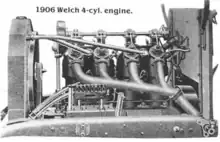 The first car, Welch Tourist, had some innovations.[1] The steering column telescoped for the driver, and an unusual two-speed transmission with all gears always in mesh was incorporated. Multiple-disc clutches within the transmission were used to select that gear that was to give the power to stop the grinding of the gears on shifting. The Welch two-cylinder vertical engine may probably be the first to use a spherical combustion chamber.