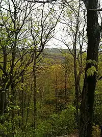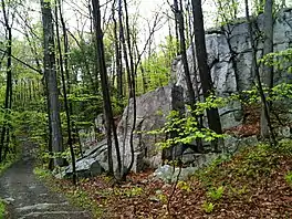 The Whitestone Cliffs Trail is a 1.7-mile (2.7 km) Blue-Blazed hiking trail in the Waterbury area in Thomaston and Plymouth, Litchfield County, Connecticut. It is contained almost entirely in a section of the Mattatuck State Forest. The mainline (official "Blue" "non-dot") trail is a loop trail with one connector trail (Blue-Blazed with yellow dot) to the Jericho Blue-Blazed Trail.