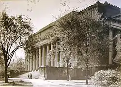 View from southeast of Widener's rear (Massa­chu­setts Ave.) facade c. 1915, before construction of Wiggles­worth Hall to the south and Hough­ton Library to the east