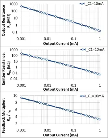 where the last form is found by substituting Eq. 5 for R2. Eq. 6 shows that a value of output resistance much larger than rO of the output transistor results only for designs with IC1 >> IC2. Figure 3 shows that the circuit output resistance RO is not determined so much by feedback as by the current dependence of the resistance rO of the output transistor (the output resistance in Figure 3 varies four orders of magnitude, while the feedback factor varies only by one order of magnitude).