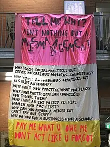 Though students are able to choose from a range of progressive and critical practices, they also object precarity of their tutors and management failures.
