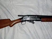 The Winchester Model 1897 and the Winchester Model 1893 were both designed by John Browning. The Model 1897 is an external hammer shotgun that is lacking a trigger disconnector. This means that the user can hold the trigger down while cycling the shotgun and once the action is returned to battery the shotgun fires.[10] The firearm itself is classified as a slide action pump shotgun. It was the first truly successful pump-action shotgun produced. Throughout the time period the Model 1897 was in production, over a million of the type were produced in various grades and barrel lengths. 16-gauge guns had a standard barrel length of 28 in (71 cm), while 12-gauge guns were furnished with 30 in (76 cm) length barrels. Special length barrels could be ordered in lengths as short as 20 in (51 cm), and as long as 36 in (91 cm). Along with various grades and barrel lengths, the Model 1897 came in two different chamberings. One was the 12 gauge and the other was the 16 gauge.[10] The shells should be of the 2+5⁄8 inch or 2+3⁄4 inch models.[5] Any shells larger are not recommended. An average Model 1897 can hold 5 or 6 shotgun shells in the magazine tube.[11] When working the action of the Model 1897 the forend (fore grip) is pulled back, forcing the breech bolt to the rear which extracts and then ejects the spent shell while simultaneously cocking the external hammer by pushing it to the rear. When the forend is slid forward again, the breech bolt pushes a fresh shell into the gun's chamber and locks into place.