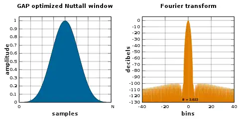 Additionally, starting with a set of expansion coefficients that mimics a certain known window function, the GAP window can be optimized by minimization procedures to get a new set of coefficients that improve one or more spectral properties, such as the main lobe width, side lobe attenuation, and side lobe falloff rate.[77] Therefore, a GAP window function can be developed with designed spectral properties depending on the specific application.