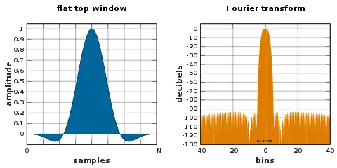 A flat top window is a partially negative-valued window that has minimal scalloping loss in the frequency domain. That property is desirable for the measurement of amplitudes of sinusoidal frequency components.[17][41] However, its broad bandwidth results in high noise bandwidth and wider frequency selection, which depending on the application could be a drawback.