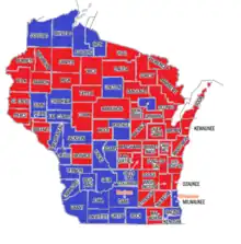 Results of the Wisconsin Gubernatorial Primary on May 8, 2012. Red counties had more votes for Walker than all Democrats combined. Blue counties had more votes for all Democrats combined than Walker.