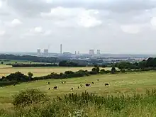 Wittenham Clumps are located at grid reference SU569925, close to the River Thames, and good views can be had from the Thames Path along the river. The panoramic views of the Berkshire and Oxfordshire countryside from the Clumps themselves are also spectacular; a viewpoint guide on the north side of Round Hill gives directions to many sights, the furthest being Faringdon Folly, a tower built on another Iron Age hillfort 27 kilometres (17 mi) to the west. Day's Lock and Dorchester Abbey are clearly visible in the valley to the north, with the 15-storey Plowman Tower in Northway, Oxford visible on the horizon, 14 kilometres (8.7 mi) away. The white-walled reactor buildings of the Joint European Torus, site of the world's first successful controlled nuclear fusion experiments, can be seen around 6 km to the north-west. To the west, there is the town of Didcot, with some of the chimneys of the gas-fired Didcot B Power Station visible. Formerly, the 110-metre-tall (360 ft) cooling towers of Didcot A Power Station, constructed in the late 1960s, dominated the skyline around Didcot; they were demolished in phases from 2014 to 2020. To the north-east is Little Wittenham Wood, which borders the Thames, and to the south-east is Brightwell Barrow.