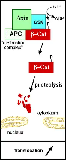 The canonical Wnt pathway (or Wnt/β-catenin pathway) is the Wnt pathway that causes an accumulation of β-catenin in the cytoplasm and its eventual translocation into the nucleus to act as a transcriptional coactivator of transcription factors that belong to the TCF/LEF family. Without Wnt, β-catenin would not accumulate in the cytoplasm since a destruction complex would normally degrade it. This destruction complex includes the following proteins: Axin, adenomatosis polyposis coli (APC), protein phosphatase 2A (PP2A), glycogen synthase kinase 3 (GSK3) and casein kinase 1α (CK1α).[22][23] It degrades β-catenin by targeting it for ubiquitination, which subsequently sends it to the proteasome to be digested.[19][24] However, as soon as Wnt binds Fz and LRP5/6, the destruction complex function becomes disrupted. This is due to Wnt causing the translocation of the negative Wnt regulator, Axin, and the destruction complex to the plasma membrane. Phosphorylation by other proteins in the destruction complex subsequently binds Axin to the cytoplasmic tail of LRP5/6. Axin becomes de-phosphorylated and its stability and levels decrease. Dsh then becomes activated via phosphorylation and its DIX and PDZ domains inhibit the GSK3 activity of the destruction complex. This allows β-catenin to accumulate and localize to the nucleus and subsequently induce a cellular response via gene transduction alongside the TCF/LEF (T-cell factor/lymphoid enhancing factor)[25] transcription factors.[24] β-catenin recruits other transcriptional coactivators, such as BCL9, Pygopus[26] and Parafibromin/Hyrax.[27] The complexity of the transcriptional complex assembled by β-catenin is beginning to emerge thanks to new high-throughput proteomics studies.[28] However, a unified theory of how β‐catenin drives target gene expression is still missing, and tissue-specific players might assist β‐catenin to define its target genes.[29] The extensivity of the β-catenin interacting proteins complicates our understanding: β-catenin may be directly phosphorylated at Ser552 by Akt, which causes its disassociation from cell-cell contacts and accumulation in cytosol, thereafter 14-3-3ζ interacts with β-catenin (pSer552) and enhances its nuclear translocation.[30] BCL9 and Pygopus have been reported, in fact, to possess several β-catenin-independent functions (therefore, likely, Wnt signaling-independent).[31][32][33]