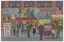 Critics noted a theatrical approach and stage-like settings of his compositions.[41] They described them as thronged with figures in a lighthearted and entertaining manner.[4] One said he showed "la vie Bohème in the Greenwich Village... done in a primitivist style that sends simplified little people running like clockwork toys all over the place in flat, knowingly spaced compositions.[38] They called his work clever and amusing, as one said, "full of vivacity and bright color, and with the careful arrangement inevitable where spontaneous appearance is successfully maintained.[28] They said his work was witty and, as one said, "wisely naïve".[1]