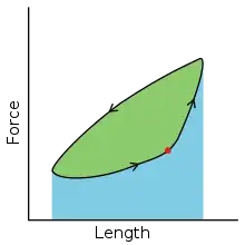 Animation of a hypothetical work loop. Note the counter-clockwise motion of the loop, indicating net work generation by the muscle (as opposed to net work absorption)