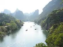 The Jiuqu Xi river (transl. Nine-bend River; also Jiuqu River), about 60 kilometers in length, meanders in a deep gorge among these hills. In most places, it is a slow, shallow stream navigable only by small craft like rowboats and canoes. However, the river narrows at one point to just a few metres but a depth of 80 metres (260 ft).[6]