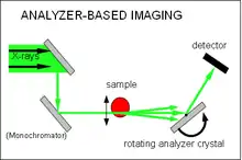 Analyzer-based imaging (ABI) is also known as diffraction-enhanced imaging, phase-dispersion Introscopy and multiple-image radiography[54] Its setup consists of a monochromator (usually a single or double crystal that also collimates the beam) in front of the sample and an analyzer crystal positioned in Bragg geometry between the sample and the detector. (See figure to the right)