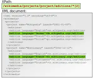 selects addresses of all English Wikimedia projects (text of all edition elements where language attribute is equal to English). And the following