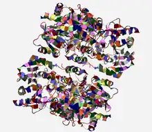 In the enzyme's crystal structure (figure 4) there is the presence of superimposible hexamers in the crystal forms imply that the hexamer is the predominant form under crystallization conditions. The structure is best described as a dimer of trimers. The 3D structure is shown below. From the 3D structure, the protein domain is a mixed of alpha helix and beta sheet. The alpha helix and beta sheet creates a loop.