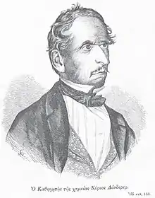 He was born in Munich in 1809. He studied at the University of Munich[9] around 1831-32. He studied pharmacology. One of his professors was Johann Andreas Buchner. Landerer eventually married Euphrosyne.[10] The couple had four daughters; three of their names were Sophia, Iphigenia, and Amalia. All his sons died at a young age. In 1832, the Kingdom of Greece was established. Landerer became one of the pharmacists of the new King. By age 26, Landerer became a citizen of the newly founded Kingdom because of the Greek Nationality Act of 1835. Between 1834 and 1835, Landerer doctor Ioannis Vouros and the director of the Royal Pharmacy Josef Sartori formed a special committee to assemble a pharmaceutical book known as pharmacopoeia. The book was characteristic of the pharmaceutical drugs available at the time. The language of the book was Greek and Latin. The book was published in 1837 it was entitled Greek Pharmacopoeia (Ελληνική Φαρμακοποιΐα). That same year he became one of the first professors at the newly founded University of Athens. He taught physics, chemistry, and pharmacology. He was the first professor of chemistry in Greece. He helped organize the newly founded university along with Konstantinos Negris and Dimitrios Stroumpos. Landerer continued writing. He wrote articles for Buchner's Repertorium a German pharmacological journal founded by his professor Johann Andreas Buchner. Landerer also did extensive research on the hot springs of Greece. He was also a notable botanist. Greek mathematician Ioannis Papadakis also decided to study at the University of Munich around 1836.[2][11]
