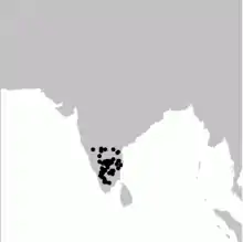 Some well-known locations include the Nandi Hills,[8] Horsley Hills,[9] Gingee,[10] Yercaud[11] and the Biligirirangans.[12] The species is also seen in some parts of the Western Ghats including the Anamalais.[13][14][15][16][17][18][19] The northern limit is believed to be in the Nallamala range,[20] but it is suspected that the species may extend in range into the northern Eastern Ghats of Orissa.[21][22]