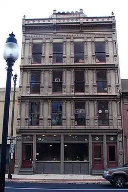The building consists of two independent sections connected by an overhead walkway. The front facade was built using cast iron and pressed metal and features decorative pilasters and long, slender windows.[2]