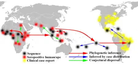 - ↑ Haddow AD, Schuh AJ, Yasuda CY, Kasper MR, Heang V, Huy R, et al. (2012). "Genetic characterization of Zika virus strains: geographic expansion of the Asian lineage". PLOS Neglected Tropical Diseases. 6 (2): e1477. doi:10.1371/journal.pntd.0001477. PMC 3289602. PMID 22389730.