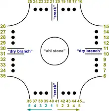 When a player completes a full circuit with their awl, they win one counter, and continue around in the same direction, moving the full value of their throw. If, however, their throw causes them to land on their space 40, they fall into the creek and are returned to space 1, losing one counter.