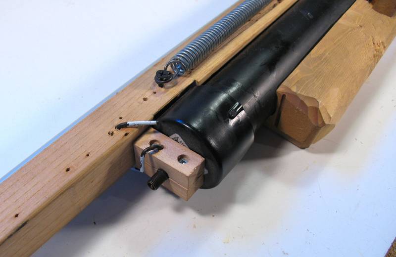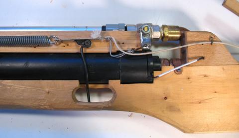 That spring is quite hard to pull back, so I added a string and a lever to help pull it when setting it. You can see the lever towards the back of the photo. The white string is attached to the lever and pulls the strip back when the lever is rotated back and down.