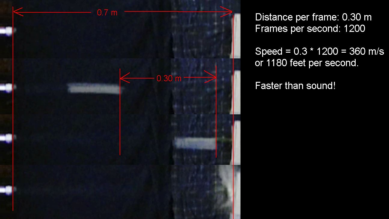 streak had traveled between two frames. 30 cm in 1/1200'th of a second,