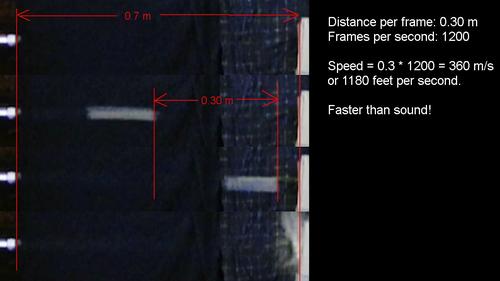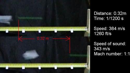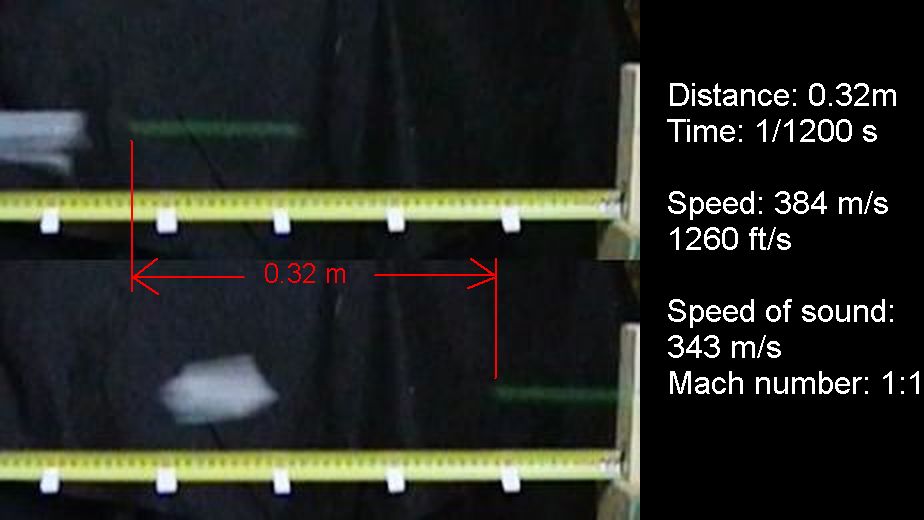 At left, two frames, with a tape measure below the flight path. The M&M travelled 32 cm in 1/1200 of a second, so that's 384 m/s, or Mach 1.1