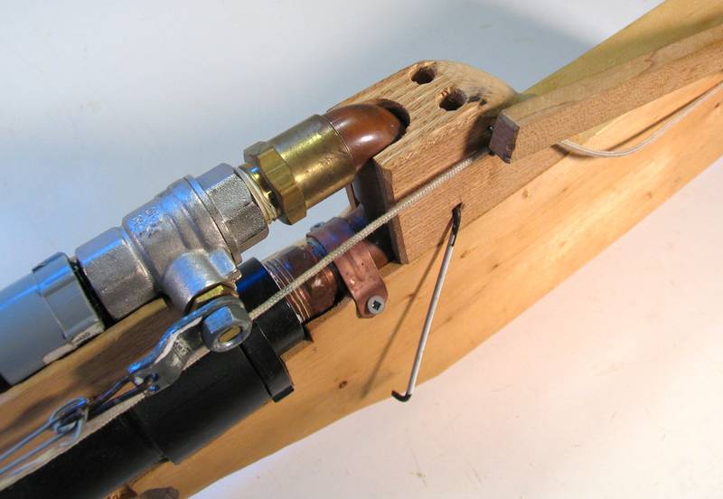 I clamped a block of wood around the bike valve to avoid accidentally pushing it into the barrel. Also, I figured the weakest point of this tank was the end cap. I was worried that that end cap might explode while I was charging it up. So I tied it to the rest of the gun using a piece of coat hanger wire. This wouldn't stop the cap from failing, but if it does fail, the block and valve won't turn into a projectile. I would prefer that this air gun be dangerous only to objects in front of it!