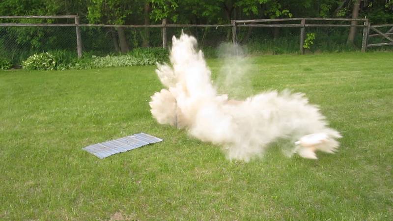 to make a dust explosion. A lit blowtorch nearby was supposed to light the dust cloud.